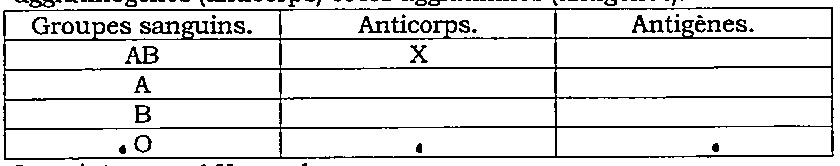 3. Le tableau ci-contre représente les groupes sanguins, les agglutinogènes (anticorps) et les agglutinines (antigènes).