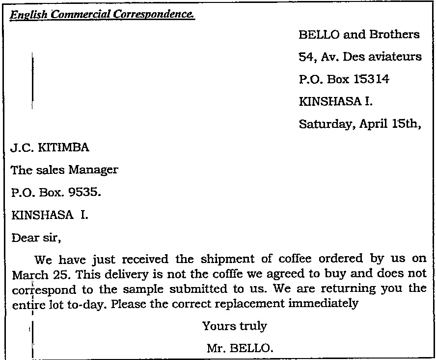 Quand quelqu’un n’est pas d’accord avec la marchandise reçue, il écrit :