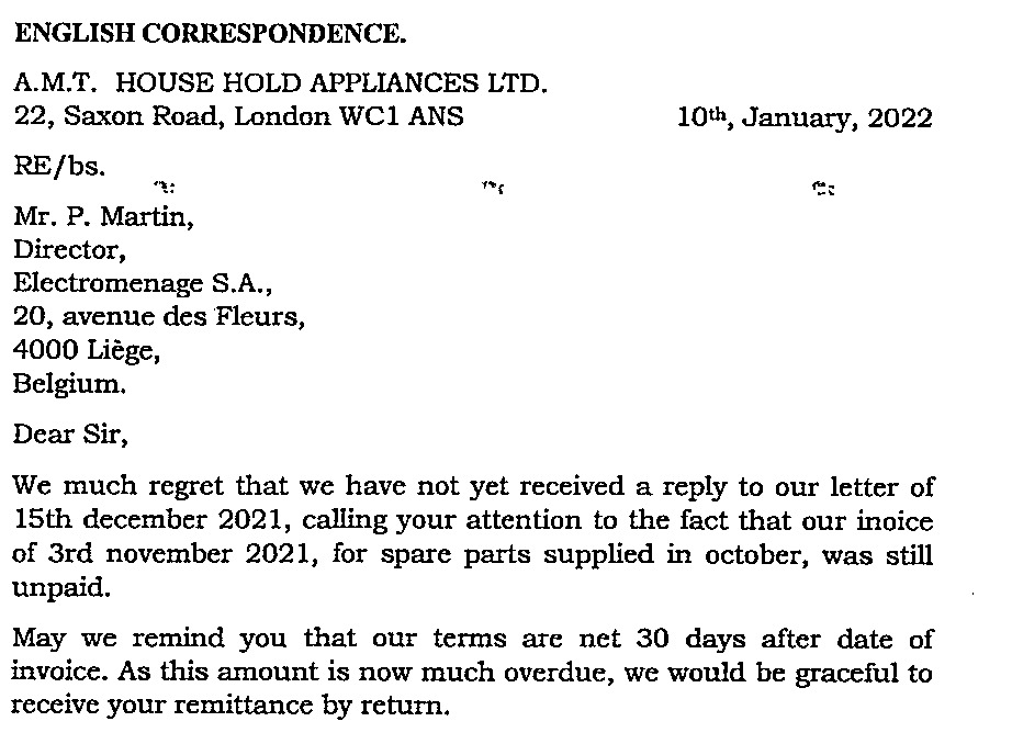Ce type de courrier est typique d’une lettre de rappel (reminder letter), envoyée lorsqu’un client n’a pas payé dans les délais.