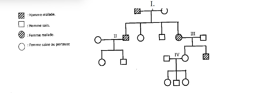 6.Le schéma ci-après représente une famille souffrant du daltonisme. Indiquez les génotypes du couple III.