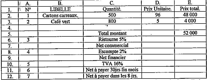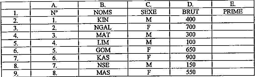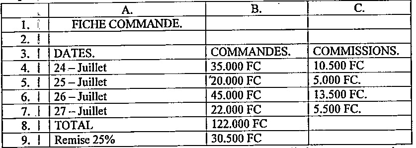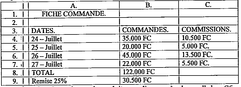 7. Madame LOMBE est cliente d’une boulangerie. On lui promet une commission de \(25\%\) si elle passe une commande inférieure à \(25.000\ \mathrm{FC}\), au-delà elle aura droit à \(30\%\). Soit l’extrait du tableau en Excel, reprenant cette situation.